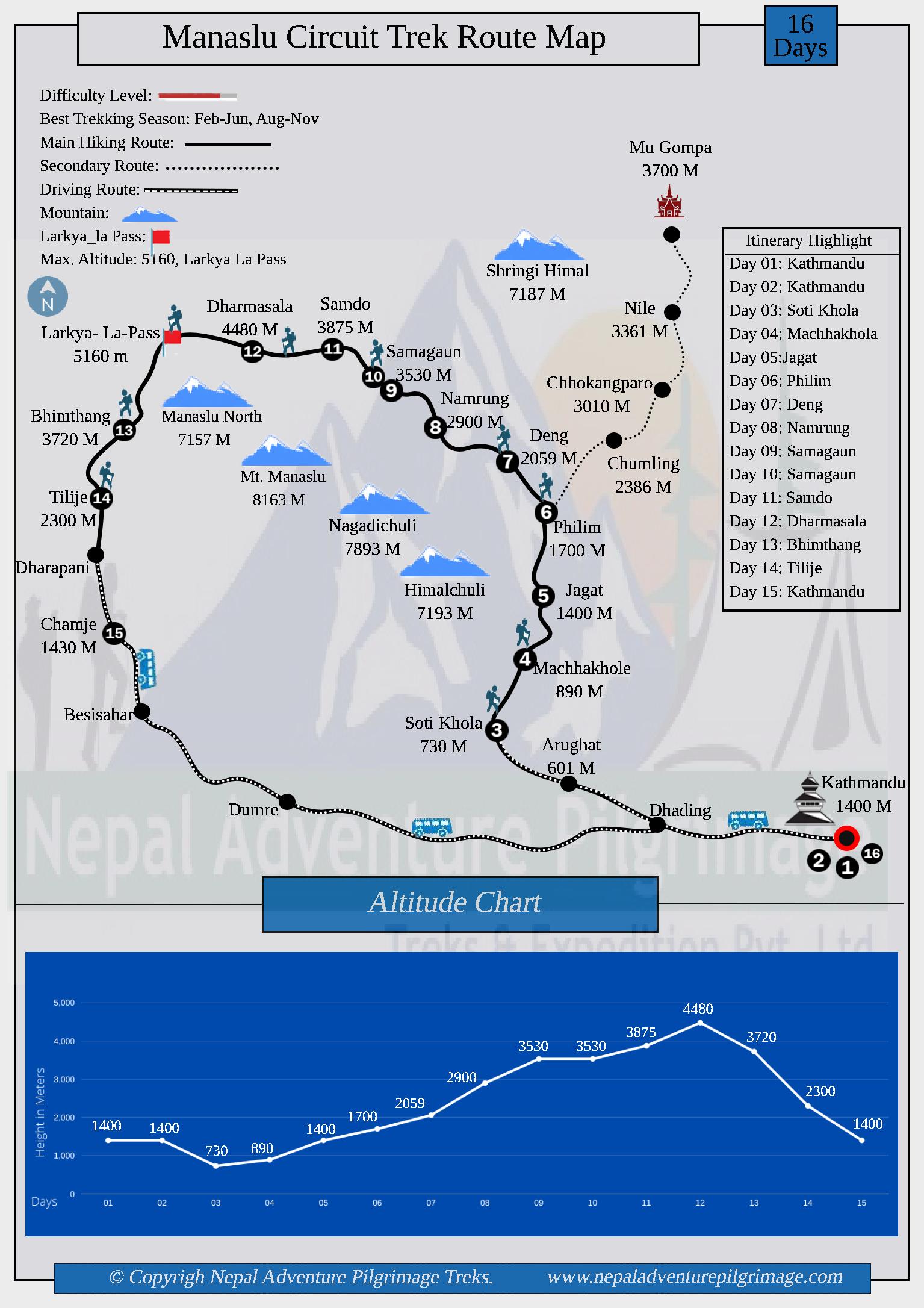 Il sentiero attraversa terreni ripidi e accidentati, con numerosi saliscendi lungo il percorso. Si cammina in aree di alta quota, e il punto più alto del trekking è il passo Larkya La, situato a 5.135 metri (16.847 ft) di altitudine.